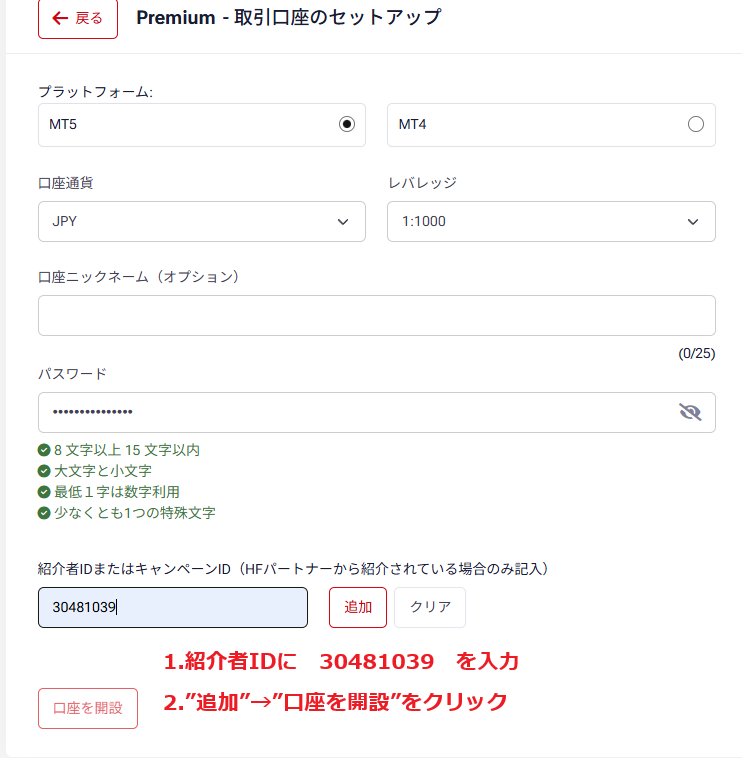 対象となるトップアップボーナス口座は、myHFエリアより開設することができ、レバレッジは1000倍、最低スプレッドは1.4pipsになります。