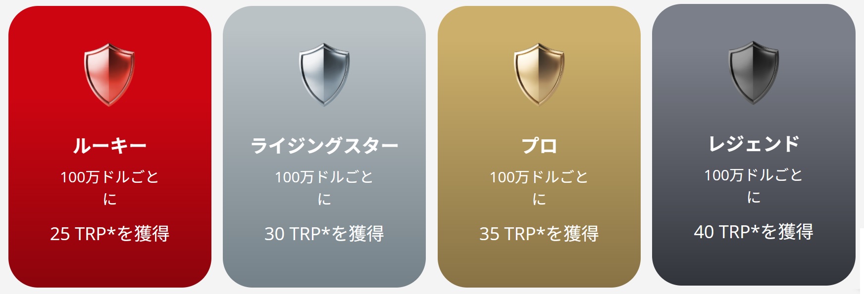 各レベルには30日ごとに満たすべき取引条件が設定されていますが、レベルが上がるほど、取引で獲得できるTRPも増えていきます。